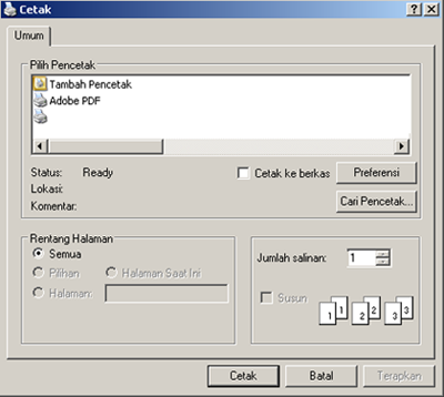 Setelan pencetakan dasar mencakup jumlah salinan dan jangkauan cetak yang dipilih dalam jendela .